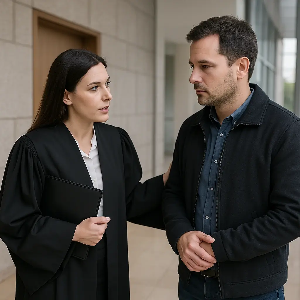 Abogada de Lexgalia hablando con un cliente preocupado en la entrada de un edificio judicial en Boiro, lista para asistirle en caso de detención o juicio rápido.